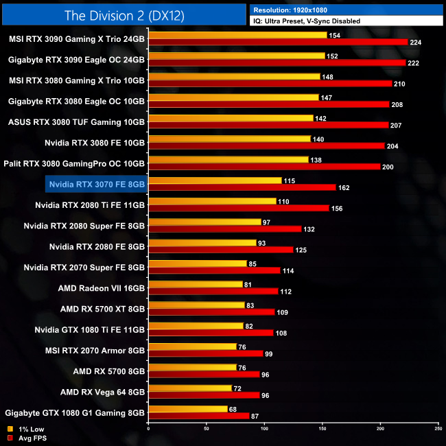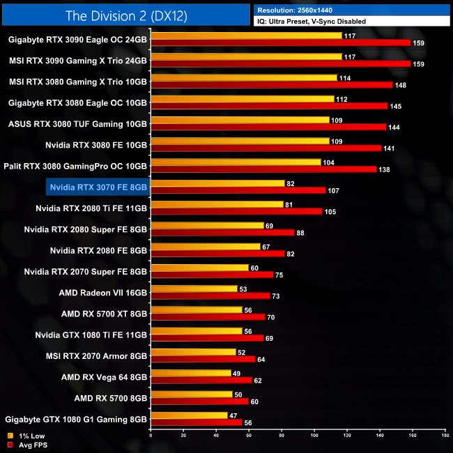 Now, in our RTX 3080 review, we noted how The Division 2 was the game that saw the single biggest performance increase for the 3080, when compared to the 2080, and the same applies to the 3070 – at 1440p, it comes in 67% faster than its RTX 2070 predecessor.