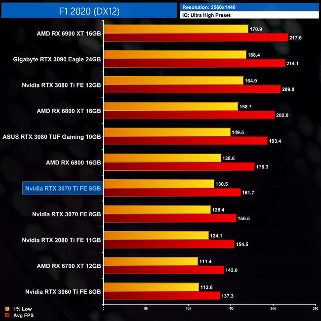 Moving onto F1 2020, the differences between the 3070 and the 3070 Ti are much more muted here. At 1440p for instance, the 3070 Ti is just 3% faster, averaging 162FPS compared to 157FPS for the RTX 3070, which isn't something I think you'd be able to notice when gaming. The RX 6800 does well in this title too, as we can see the 3070 Ti is 9% slower at 1440p.