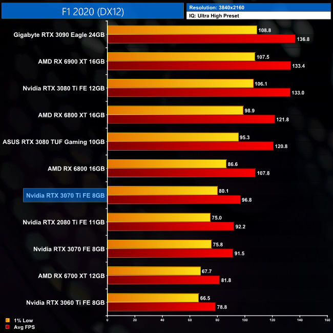 Stepping up to 4K sees the RTX 3070 Ti pull further ahead of the RTX 3070, but it's still only a difference of 6%, or 5FPS, so nothing to go crazy about. The 3070 Ti is also 10% slower than the RX 6800 at this resolution.