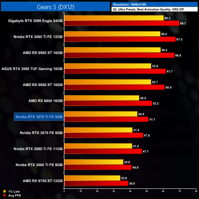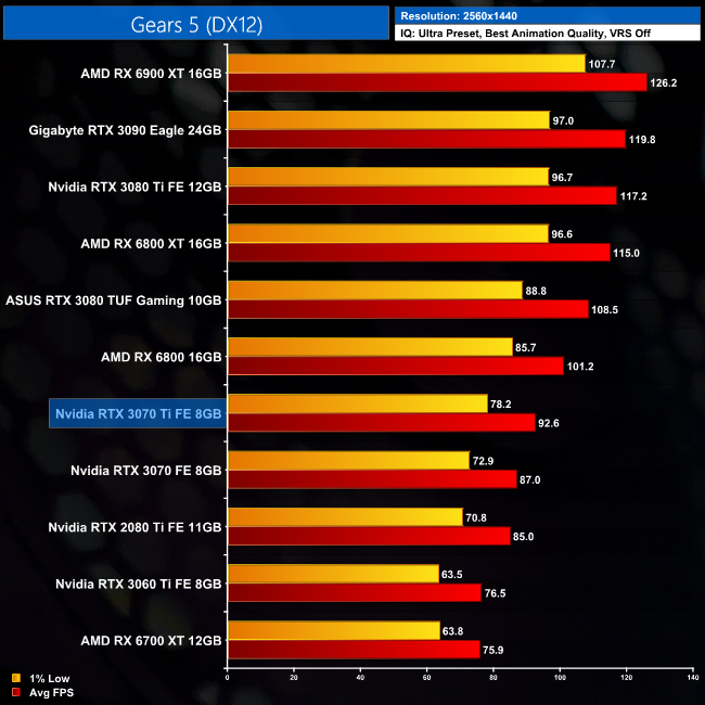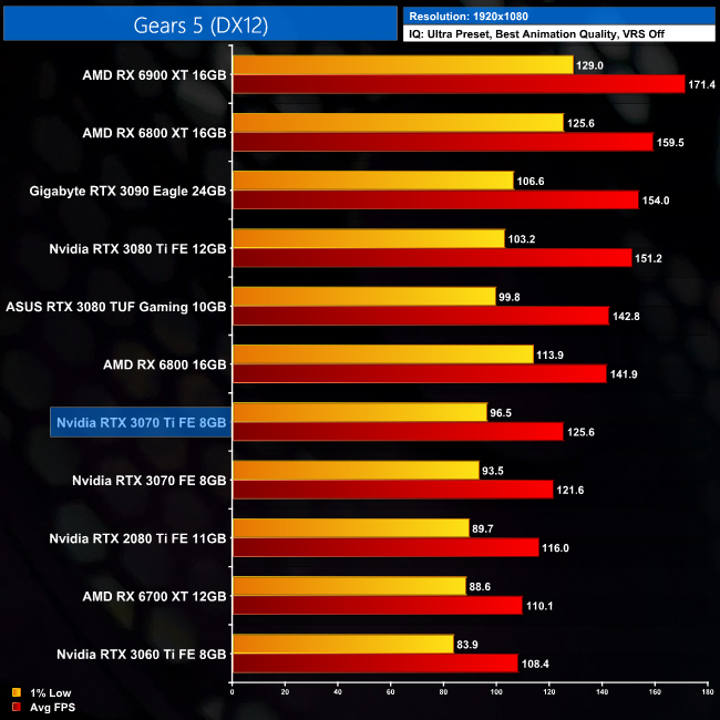 As for Gears 5, the results from this game are pretty typical of average performance. The RTX 3070 Ti comes in 6% faster than the RTX 3070 at 1440p, while that increases to 7% at 4K. The RX 6800 is still the faster card across both resolutions however, with the RTX 3070 Ti proving 9% slower at 1440p, while this shrinks to a 4% deficit at 4K.