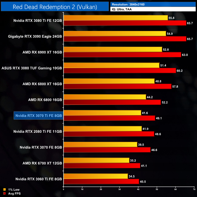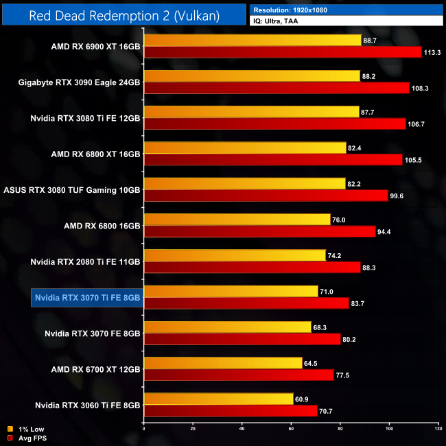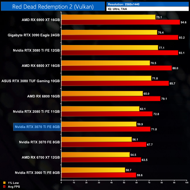 Next up we take a look at Red Dead Redemption 2, where the RTX 3070 Ti averaged 71FPS at 1440p. This makes it 5% faster than it's non-Ti sibling, which is a fairly middle of the road result. Up against the RX 6800 though, Nvidia's GPU is 10% slower at this resolution, which works out as difference of 8FPS.