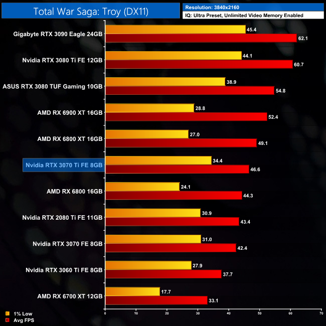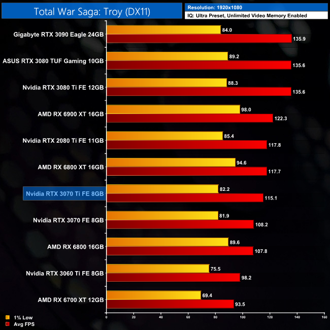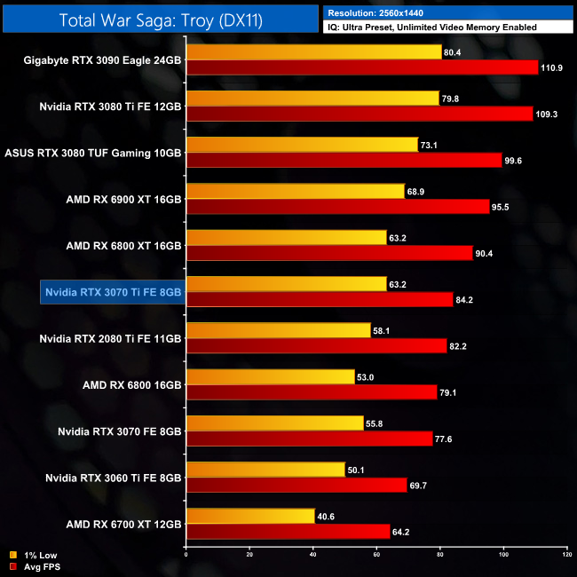 As for Total War Saga: Troy, as it turns out this is the game which shows the most benefit to the RTX 3070 Ti, when compared against the RTX 3070. At 1440p for instance, the 3070 Ti comes in 9% faster than the 3070, while it's also got the beating of the RX 6800 in this title.