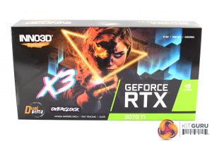 Looking now at the Inno3D RTX 3070 Ti X3 OC, this ships in an eye-catching box, though no image of the card is visible on the front. Inside, the only included accessories are a couple pieces of documentation.