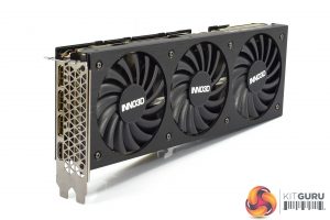 Looking now at the cooler, Inno3D is using three finstacks connected by a total of 5 heatpipes. The GPU and memory contact with a central baseplate, while there are secondary plates to cool the VRM.