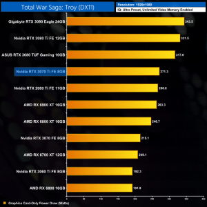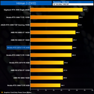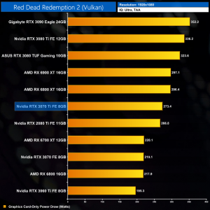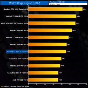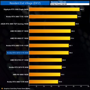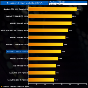 Power draw averaged 263.3W at 1080p, which is more or less equivalent to the RTX 2080 Ti Founders Edition. This is a bit below the 290W rated TGP, with a handful of titles not fully utilising the GPU at this resolution.