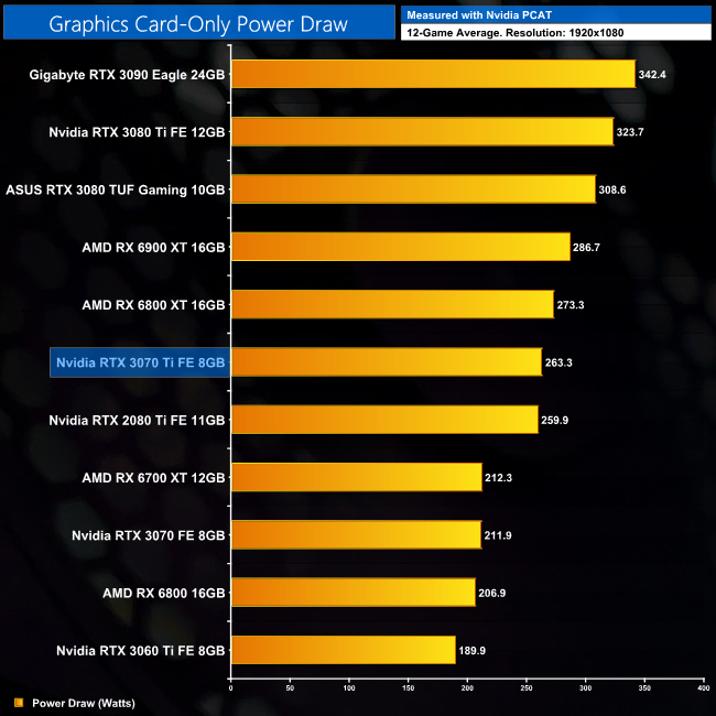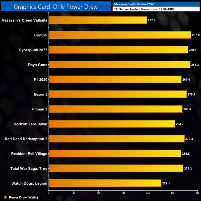 Here we present power draw figures for the graphics card-only, on a per-game basis for all twelve games we tested at 1080p. This is measured using Nvidia's Power Capture Analysis Tool, also known as PCAT. You can read more about our updated power draw testing methodology HERE.