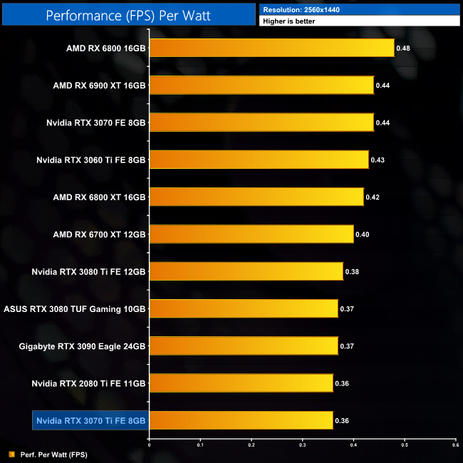As we step up in resolution, the RTX 3070 Ti roots itself to the bottom of our chart, level with the RTX 2080 Ti. Its high power draw coupled with fairly insignificant performance improvements mean the RTX 3070 is 22% more efficient, while the RX 6800 offers 33% better performance per Watt.