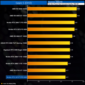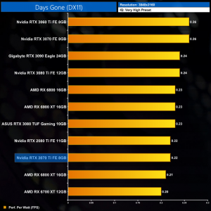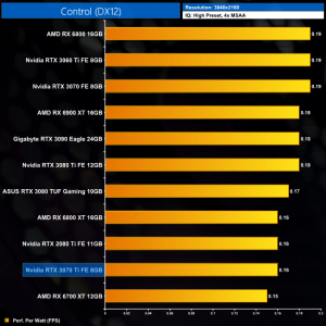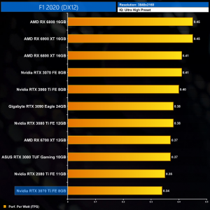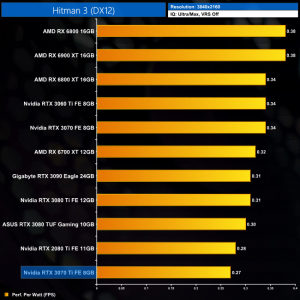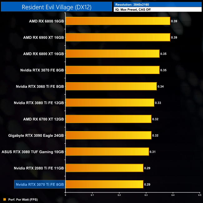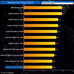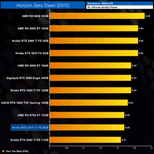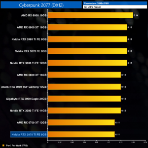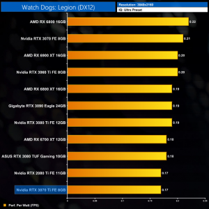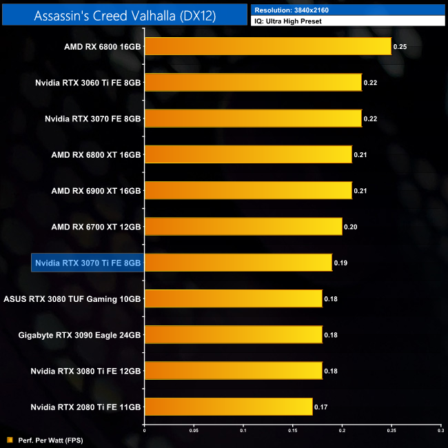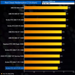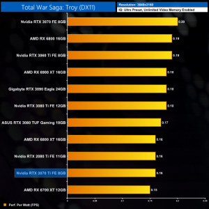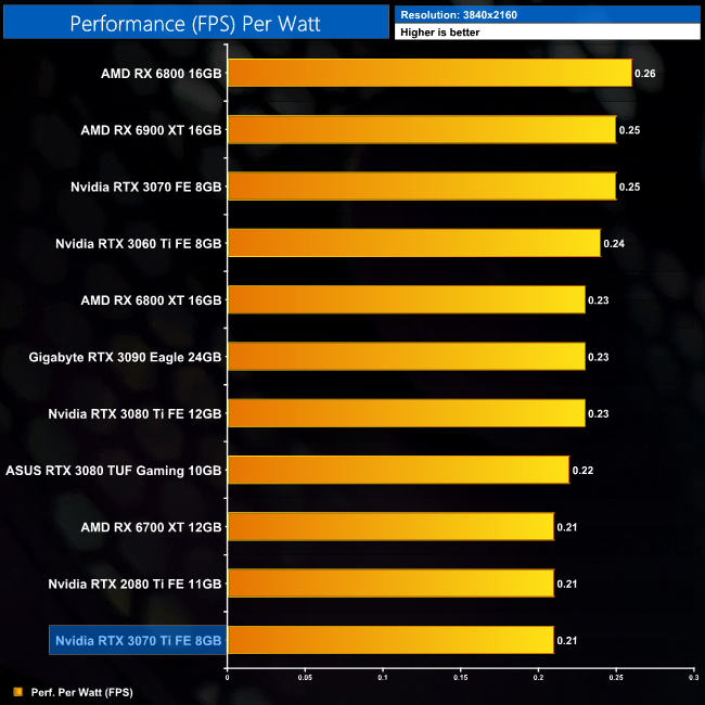 Lastly, at 4K we see more of the same. The RTX 3070 Ti is joint-bottom for power efficiency out of the 11 cards we have tested, clearly beaten by the likes of the RTX 3070 and RX 6800.