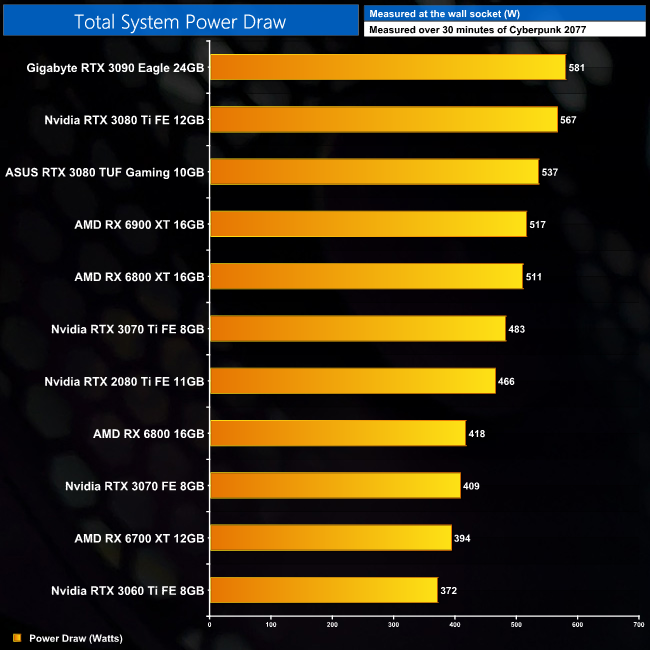 We measure system-wide power draw from the wall while running Cyberpunk 2077 for 30 minutes.