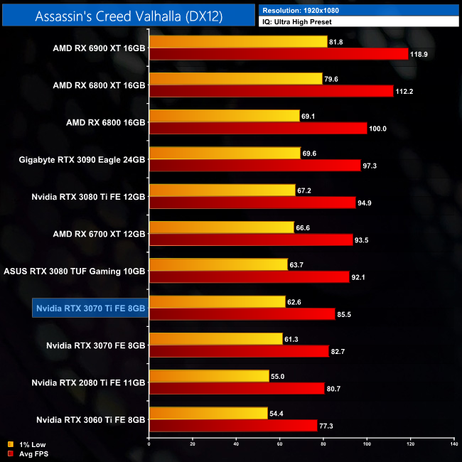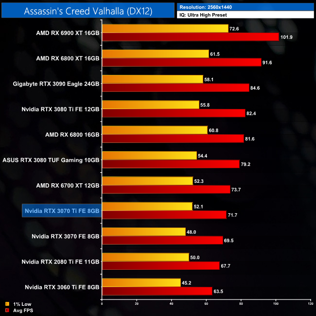 Kicking off the game benchmarks with Assassin's Creed Valhalla, this isn't the best of starts for the RTX 3070 Ti. At 1440p, it averaged just shy of 72FPS, making it barely 3% faster than the vanilla RTX 3070. That puts it well behind the RX 6800, which is particularly strong in Valhalla, with a 12% margin between the two cards.