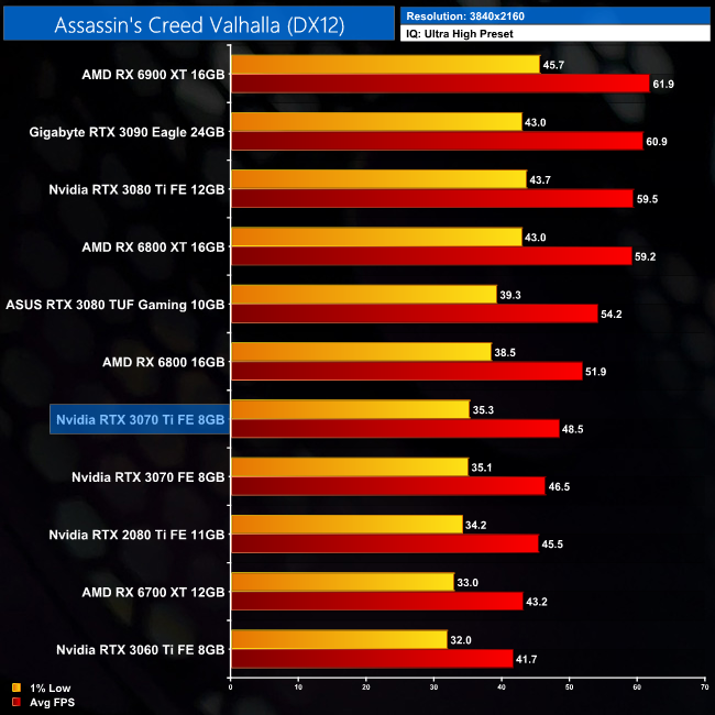 As for 4K, here the 3070 Ti has caught up to the RX 6800, though it's still 7% slower. The main thing however is we're still only looking at a 4% uplift versus the RTX 3070, so it's really not much of a difference at all in this game.