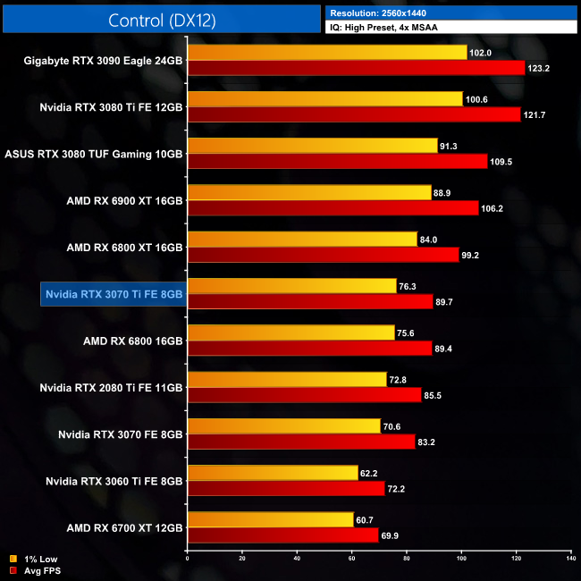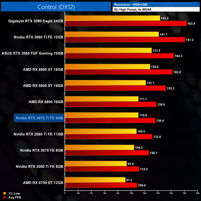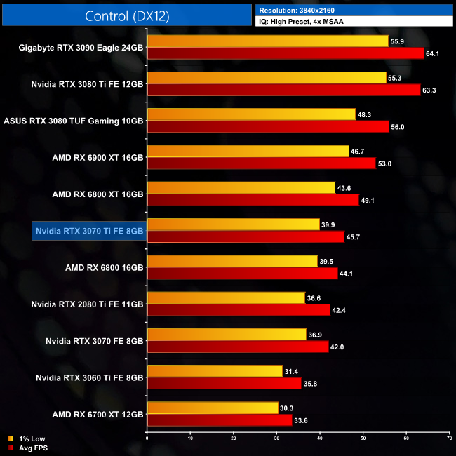 Next is Remedy's Control, and the RTX 3070 Ti is stronger here. First and foremost, Nvidia GPUs do much better in this game so it's no surprise to see the RTX 3070 Ti edging ahead of the RX 6800 at 1440p and 4K. That's also because the 3070 Ti is 8% faster than the RTX 3070 at 1440p, and 9% faster at 4K, so the benefits to this new GPU are much more noticeable in this title. It's still not a stunning difference between the two xx70-series SKUs, but it's not nothing.
