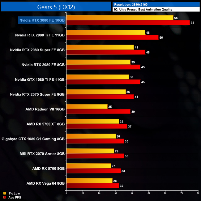 We're really seeing the 3080 do best at 4K, and that's no different in Gears, with the card's relative performance lead over the 2080 increasing to 67% as we bump up the resolution.