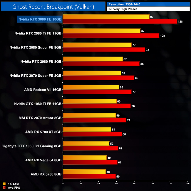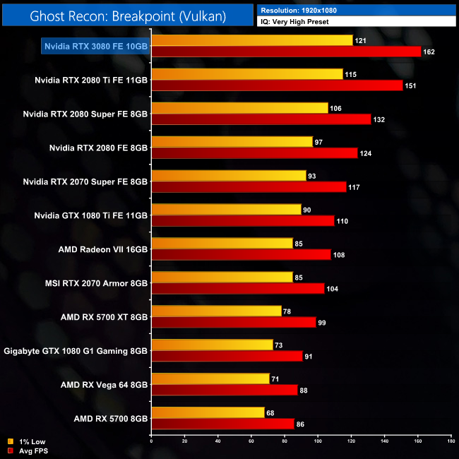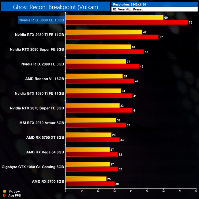 Ghost Recon: Breakpoint is another game where the 3080 doesn't scale quite as well at the lower resolutions as we have seen in other titles. At 1440p, for instance, it's 19% faster than the 2080 Ti, and 49% ahead of the RTX 2080. These are still highly impressive numbers, there's no denying it, but they're not as high as other games such as Gears 5 or The Division 2.