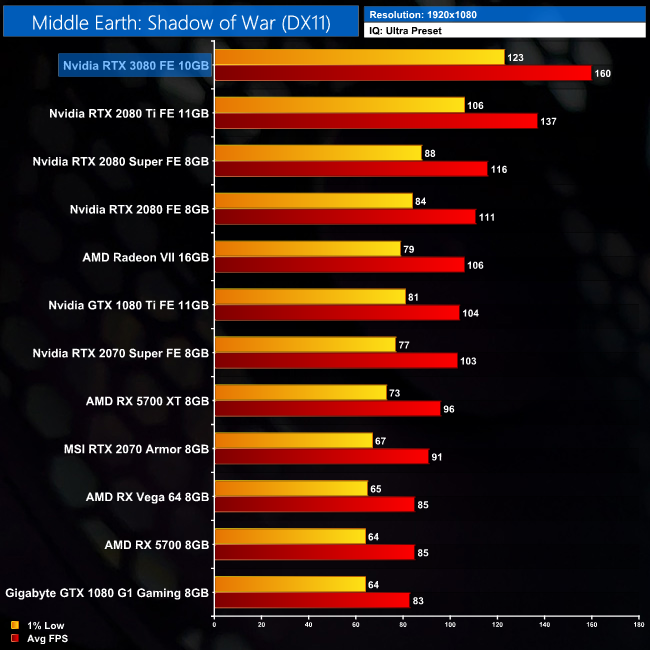 Moving onto Shadow of War, despite being nearly three years old this is still a pretty intensive DX11 title. Even then, the RTX 3080 continues its strong performance, averaging 125FPS at 1440p, with a 54% performance lead over the RTX 2080.