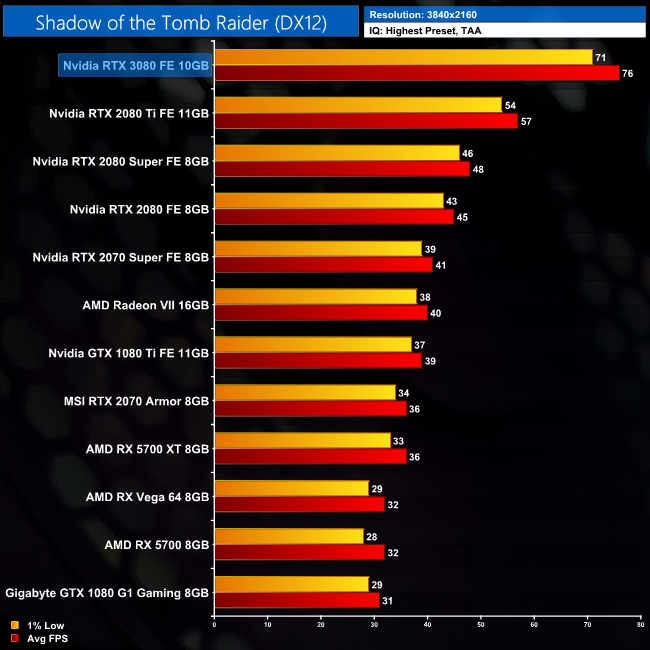 Our penultimate game of the day is Shadow of the Tomb Raider, one of the first games to be announced with RTX features. Here the 3080 solidifies its position as top dog, beating out the 2080 Ti by 27% at 1440p.