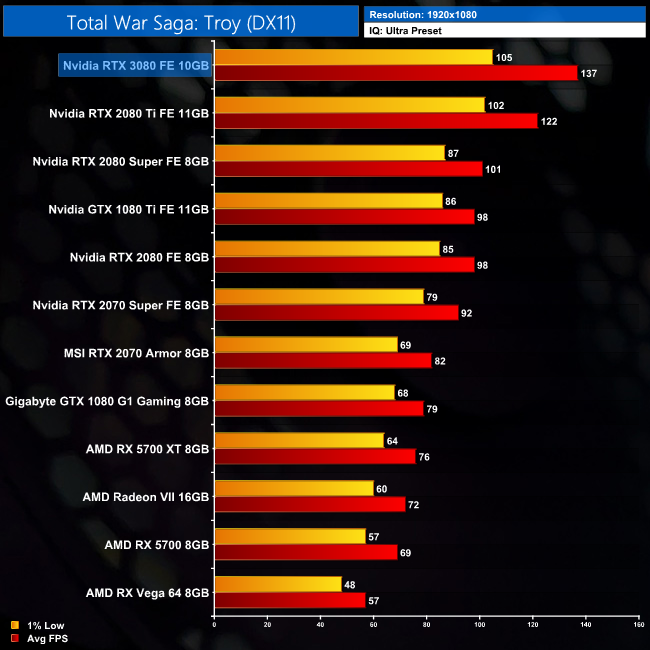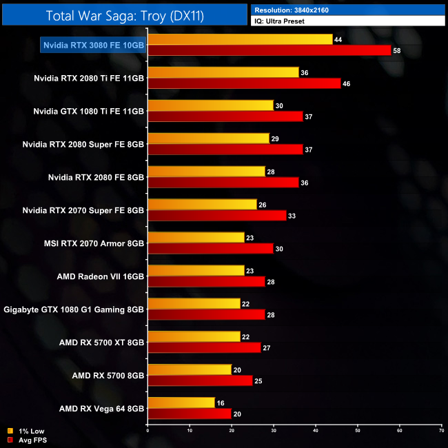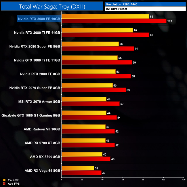 Finally we come to Total War Saga: Troy. Like Ghost Recon: Breakpoint, I suspect CPU bottlenecking comes into play here, as even at 1440p we're not seeing quite the same scaling as our other titles, as demonstrated by the 3080's 20% lead over the RTX 2080 Ti. It's still a very healthy improvement, but we have seen better.