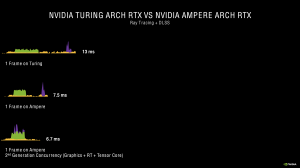 Using Wolfenstein Youngblood as an example, if Ampere tried to render a ray traced frame through software, without using the RT or Tensor cores, Nvidia claims we would be looking at a frame time of 37ms, or about 27fps. Thanks to the RT cores, ray tracing is significantly easier to run than through software, so the frametime can be reduced to 11ms. Once DLSS is added to the workload via the Tensor core, the render time is further reduced to a 7.5ms frametime. Nvidia claims that executing all three operations concurrently, however, will improve performance further, with a frametime of 6.7ms, or 149fps.