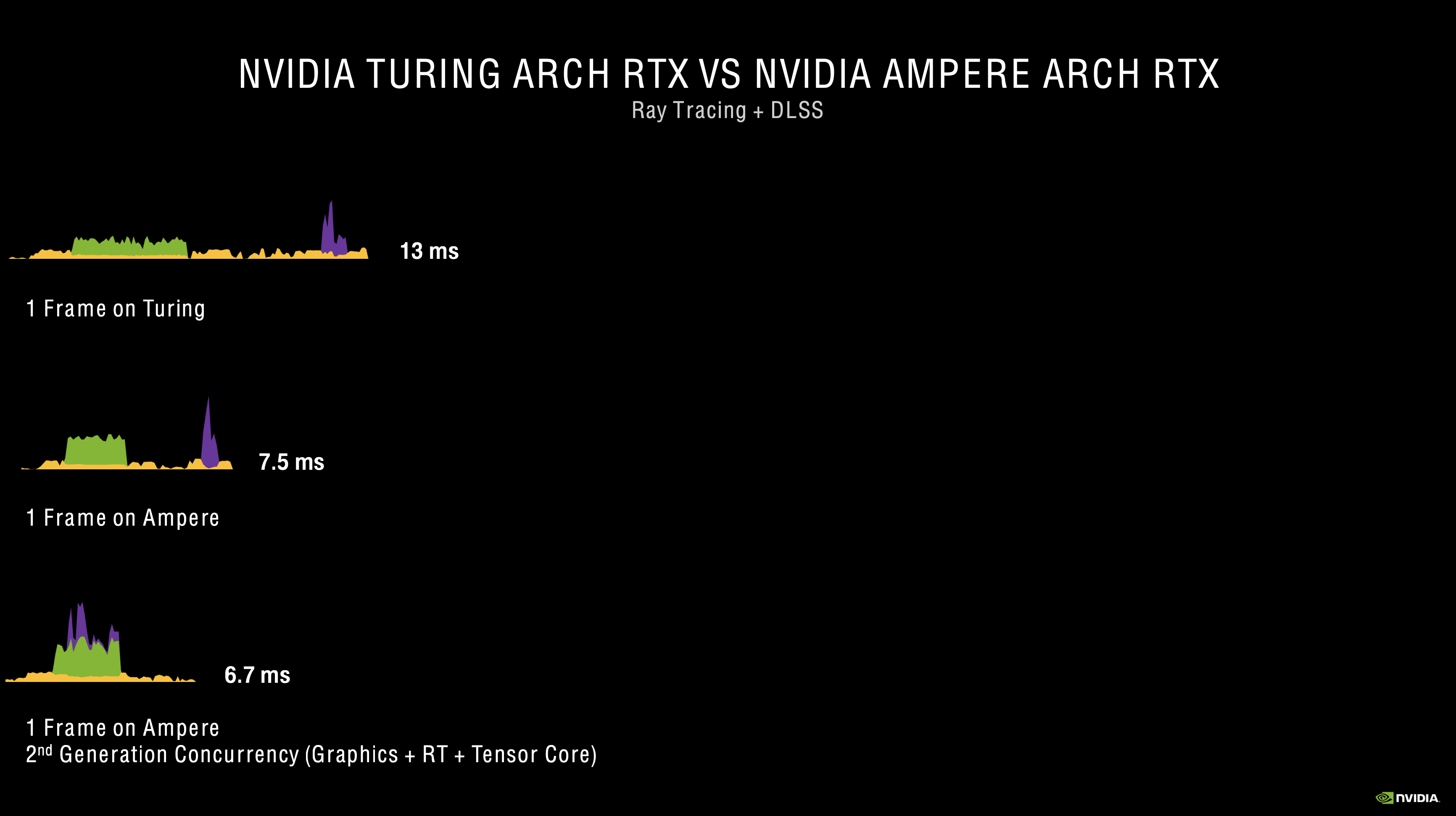 Alongside improvements to the Tensor Cores and RT cores themselves, Nvidia has also introduced what it calls Second Generation Concurrency. With Turing, the GPU was limited to executing the shader and RT pipelines concurrently, while any DLSS (Tensor) workloads had to come further down the pipeline. With Ampere, it is now possible to execute shader, RT and DLSS operations concurrently, improving performance to the end user.