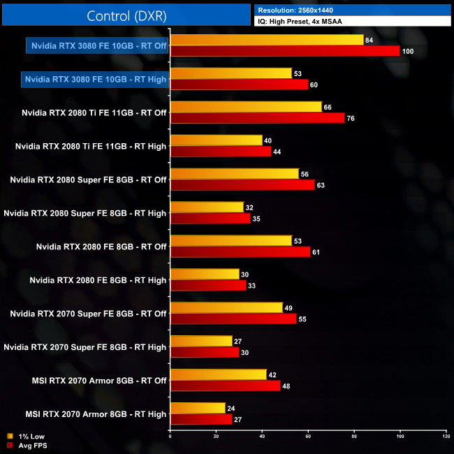 Here we revisit Control, this time testing with the in-game ray tracing effects set to their highest values.