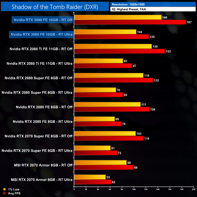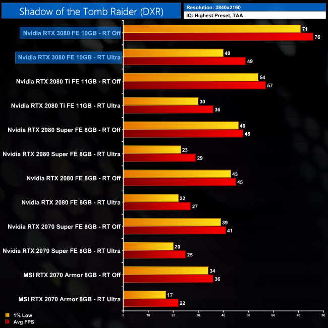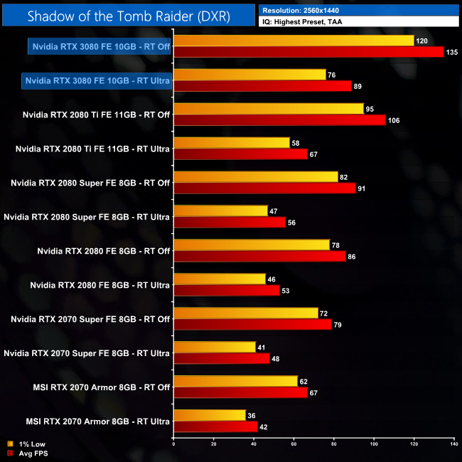 At 1440p, for instance, the 3080 is 33% faster than the 2080 Ti with RT On. With RT off, the difference is 27%. As for 4K, here the 3080 outperforms the 2080 Ti by 36% when RT is on, compared to 33% when RT is off.