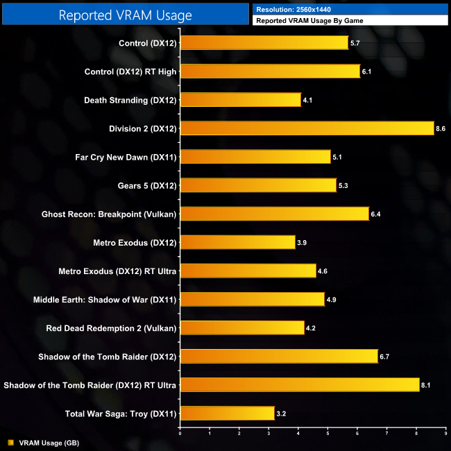 The numbers are certainly interesting. I would disregard The Division 2 as the game was requesting up to 9GB VRAM even when sitting in the settings menu, so for me that is certainly a case of the game making sure it doesn't run out of memory by requesting pretty much everything that was available.