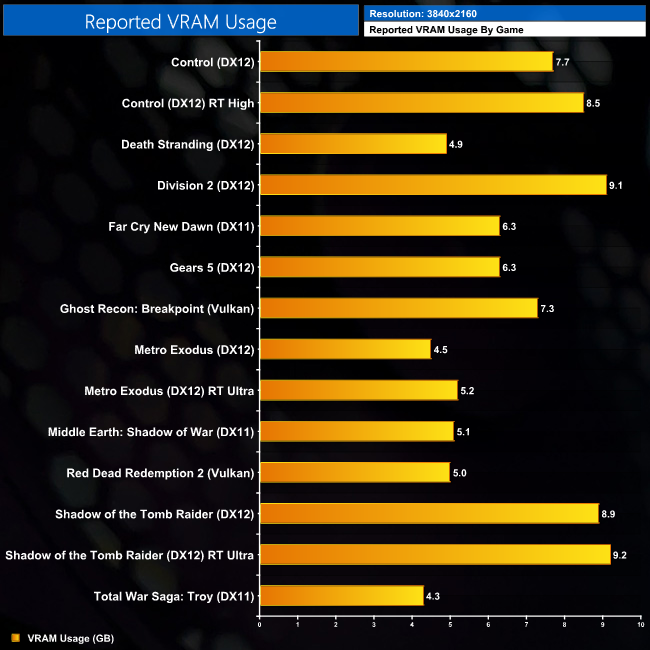 One of the concerns we have heard from enthusiasts in the build up to this launch has been in regards to the amount of memory supplied with the RTX 3080, and particularly the 8GB RTX 3070. While we can't comment on the latter card today, I thought it would be worth taking a look at all the games we tested and their amount of VRAM requested by each.