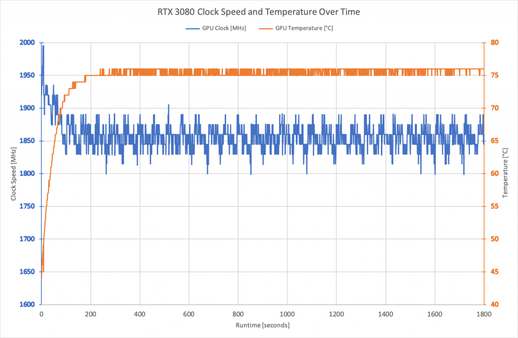In terms of overall clock speed behaviour, Ampere doesn't appear to have changed anything compared to Turing. GPU Boost will still push clock speed well above the rated frequency, before settling down as temperature increases. These adjustments still happen in steps of 15MHz so those hoping for more granular control will be disappointed.