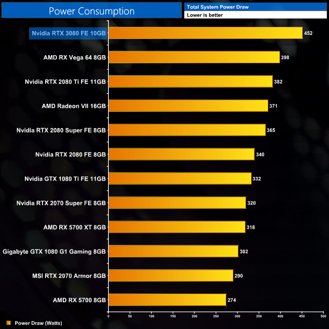 While total system power draw isn't an ideal metric for comparisons, we're seeing roughly 33% higher power draw than the RTX 2080. Directly comparing the rated TGPs of each card, the 3080's is 42% higher, while delivering on average 68% increased performance at 4K – certainly suggesting some efficiency improvement relative to that GPU.