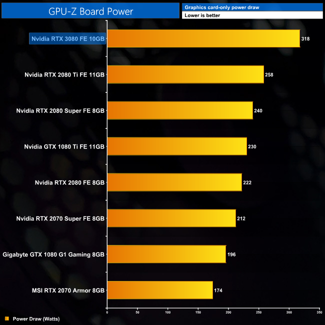 Following on from our total system power draw testing on the previous page, we re-ran some of our tests, this time looking at the Board Power metric as reported by GPU-Z. This is currently only available for Nvidia cards, which is why we have excluded AMD results from the chart. Aside from the fact this is software-based reporting, and not a hardware measurement of the PCIe power cables and PCIe slot (for that we'd need something like PCAT), this should provide us more accurate data to work with as it is measuring only the GPU power, and not total system power which is a fundamentally imprecise measurement.