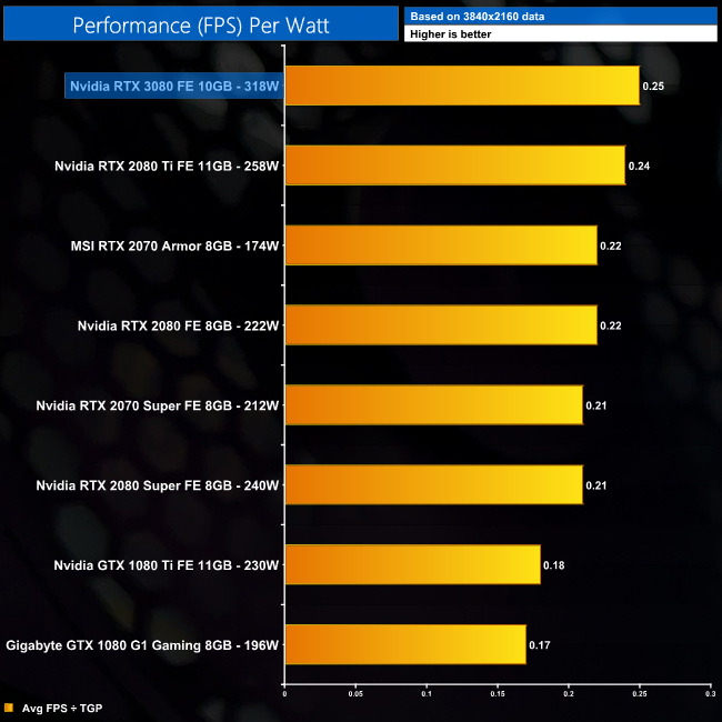 The data here more-or-less confirms our thoughts from the previous page, namely that the RTX 3080 sees a larger (13%) performance per Watt improvement when compared to the RTX 2080, than it does compared to the RTX 2080 Ti (just 4%). It is still an improvement, yes, but it is clear Ampere is all about the performance, with efficiency gains seemingly less of a priority here.