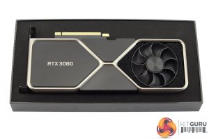 The RTX 3080 Founders Edition ships in a new style of box that is largely black, but with some silver accents. The Nvidia logo sits in the top left corner, just above the GeForce RTX branding.