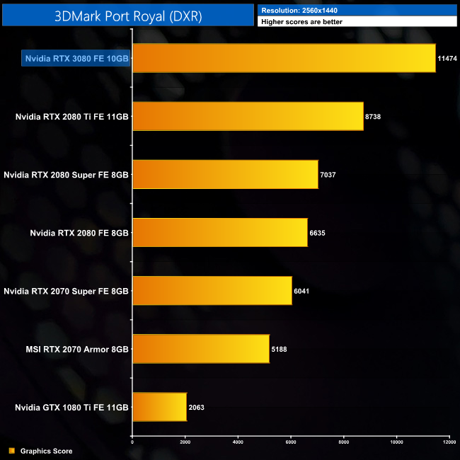 Now we come to Port Royal, 3DMark's ray tracing benchmark. Here the relative gains for the RTX 3080 versus the RTX 2080 are even bigger than what we saw in Fire Strike or Time Spy – delivering 73% increased performance. Compared to the 2080 Ti, it's 31% faster.