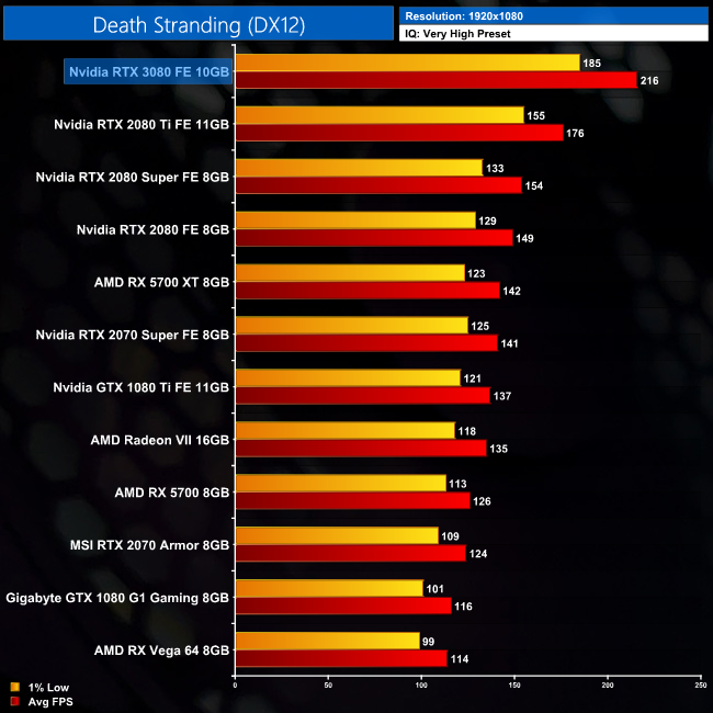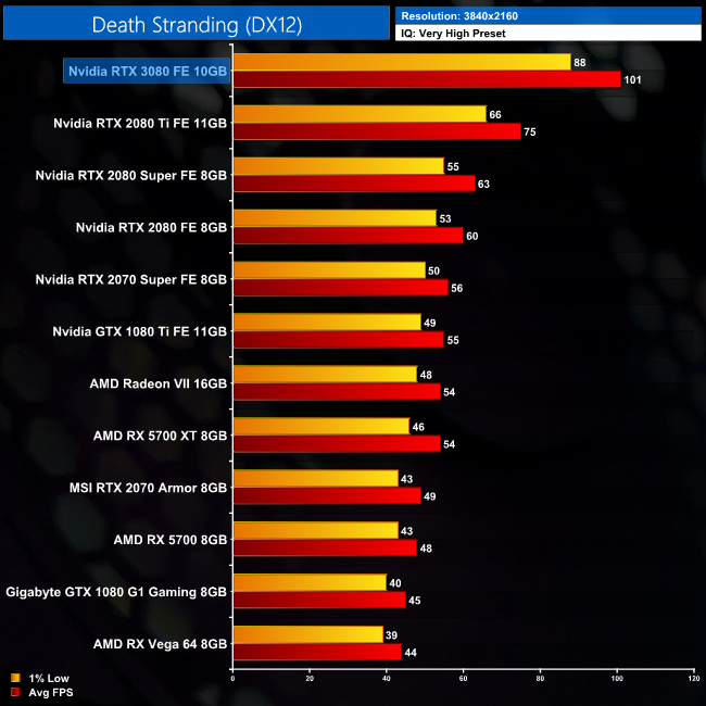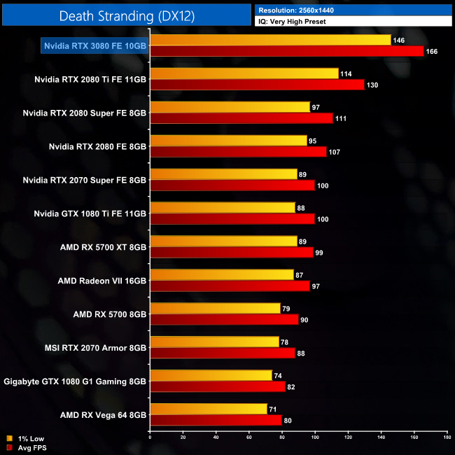 Next up is Death Stranding. Frame rates are exceedingly high in this game, and the 3080 takes that to the next level. At 1440p, this Ampere GPU is 28% faster than the 2080 Ti, 50% faster than the 2080 Super, and 55% faster than the 2080.