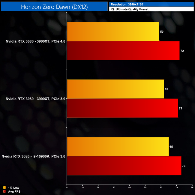 Horizon Zero Dawn is a game we introduced specifically for this testing, as we saw a number of reports suggesting the game benefitted significantly from increased PCIe bandwidth – at least when moving from PCIe 3.0 x8 to x16. We wanted to see if that carried over to PCIe Gen4 with the RTX 3080.