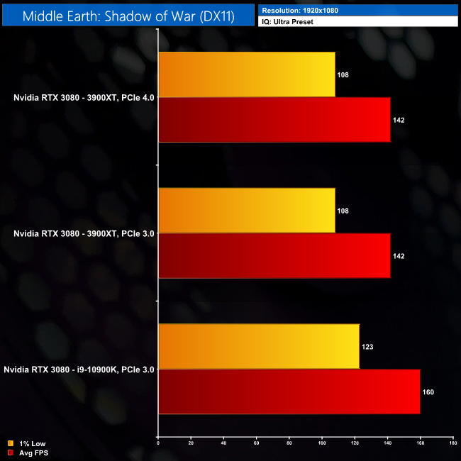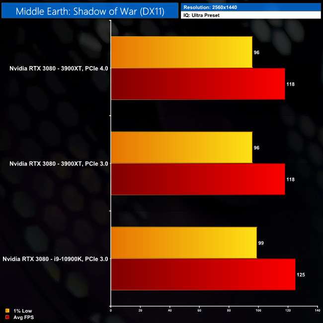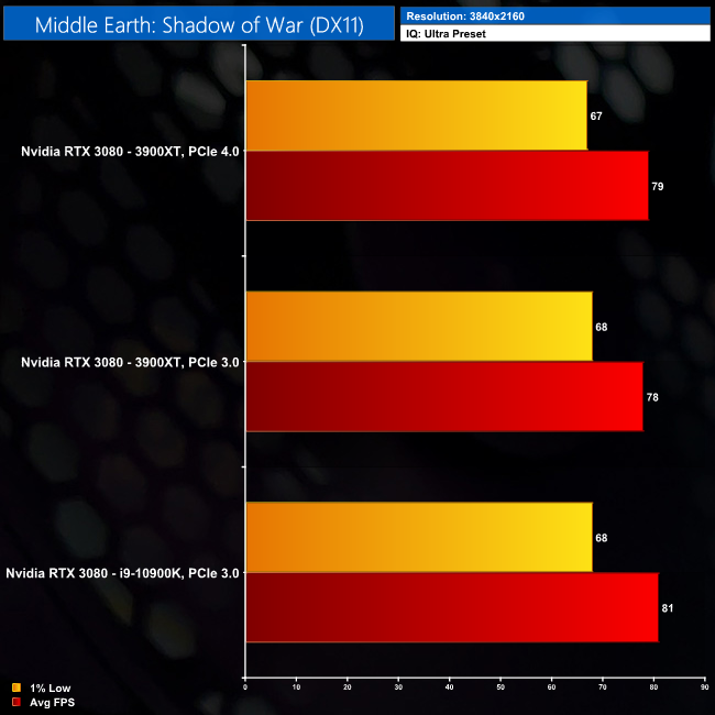 Up next is Middle earth Shadow of War, and there's not much to cover here – our Intel system wins across the board once more, with Gen4 vs Gen3 not coming into play at all apart from another 1FPS difference at 4K.