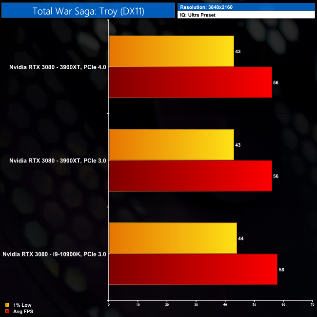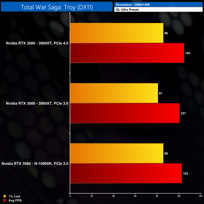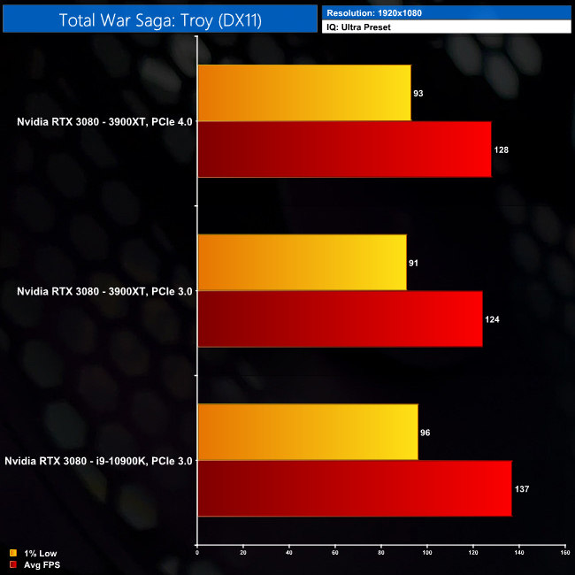 Total War Saga: Troy does show some performance gains with PCIe 4.0. Granted, the 10900K system is still faster at 1080p, but the 3900XT with PCIe 4.0 is 3% faster than the same CPU with PCIe 3.0. In fact, at 1440p, that lead actually grows to 4%. Again, not really a game changer, but one of the largest difference we have seen today.