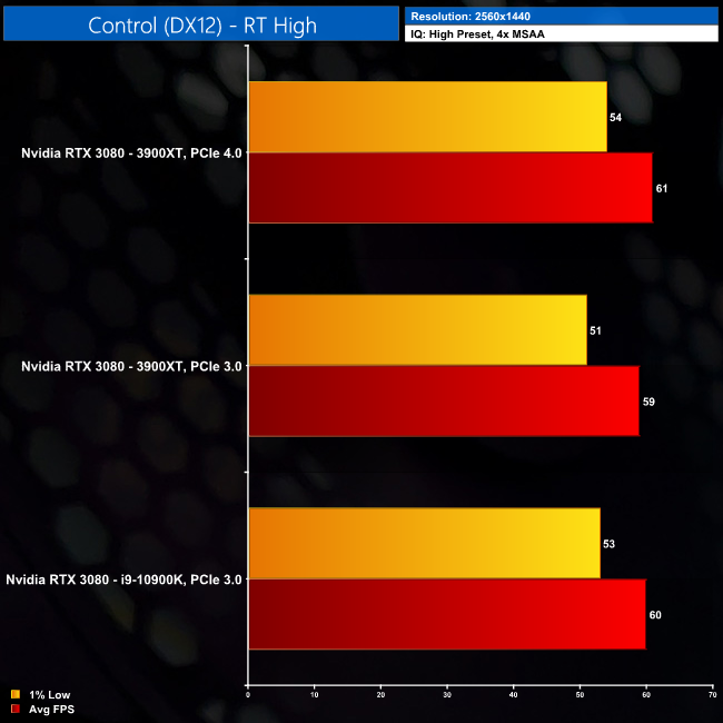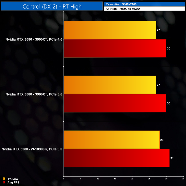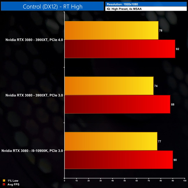 Turning on ray tracing effects in Control brings us the single biggest gain for PCIe 4.0 vs PCIe 3.0 from across all of our testing today – an improvement of 5% at 1080p. That was when comparing just the AMD test systems, but the 3900XT with PCIe 4.0 is still 2% faster than the 10900K at 1080p.