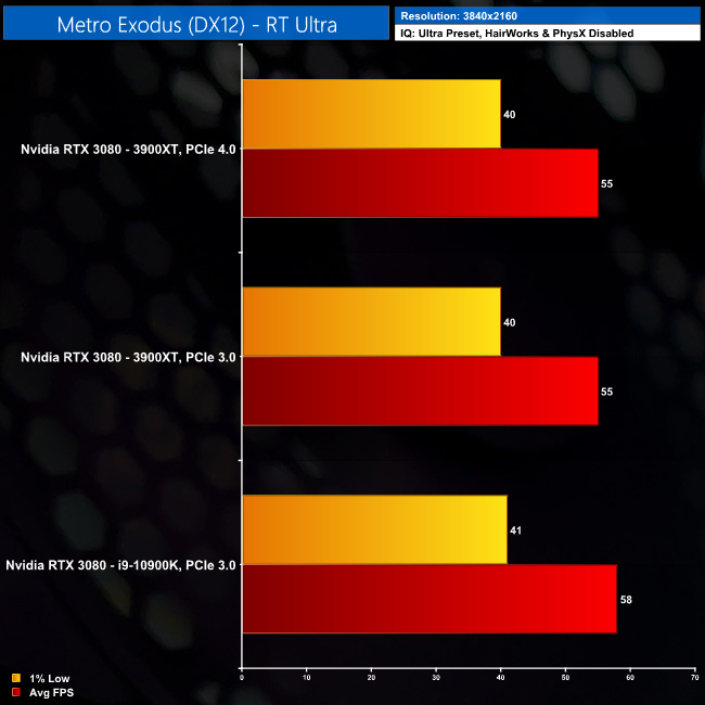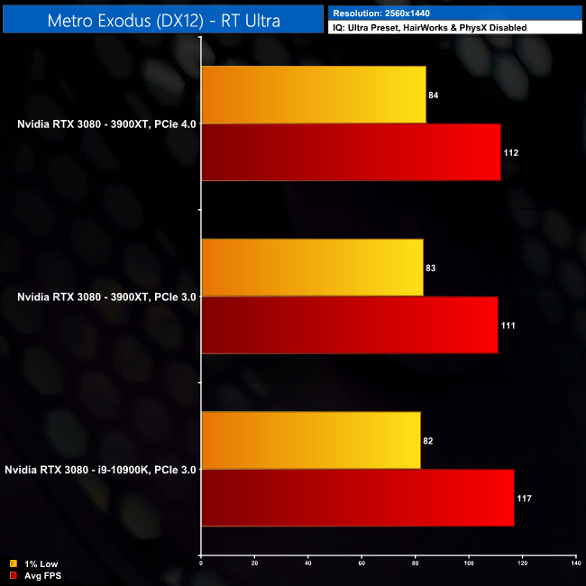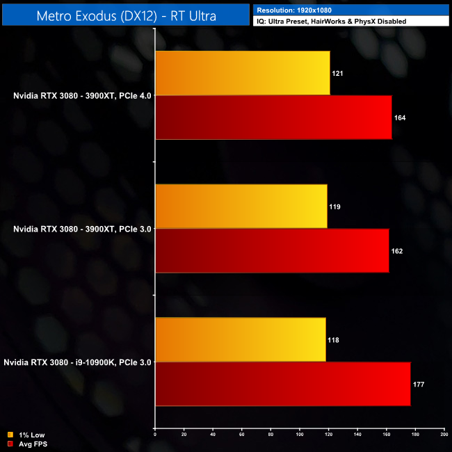 The performance trends within Metro Exodus don't really change when turning RT on. The game still prefers Intel hardware across the board, and Gen4 vs Gen3 with the 3900XT doesn't make any meaningful difference.