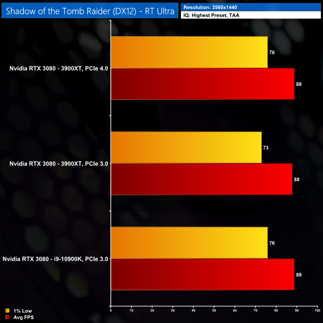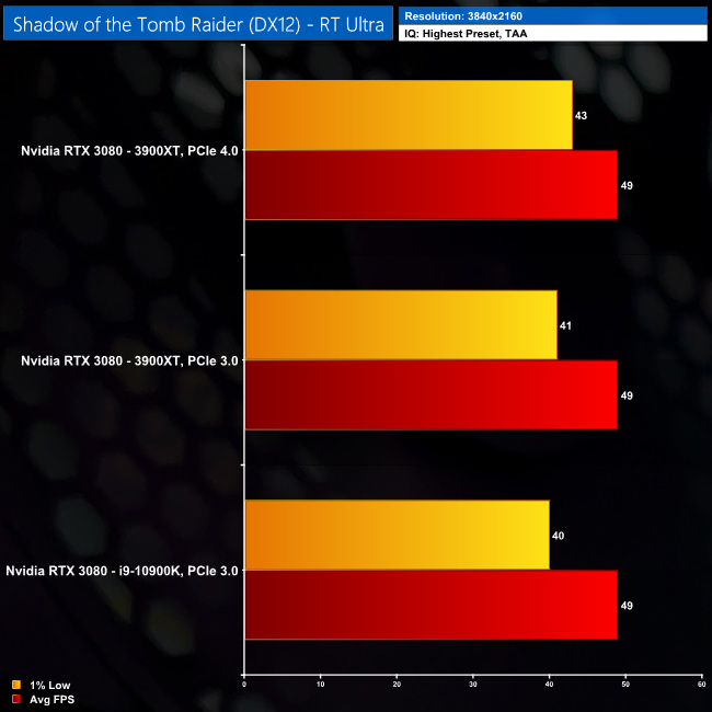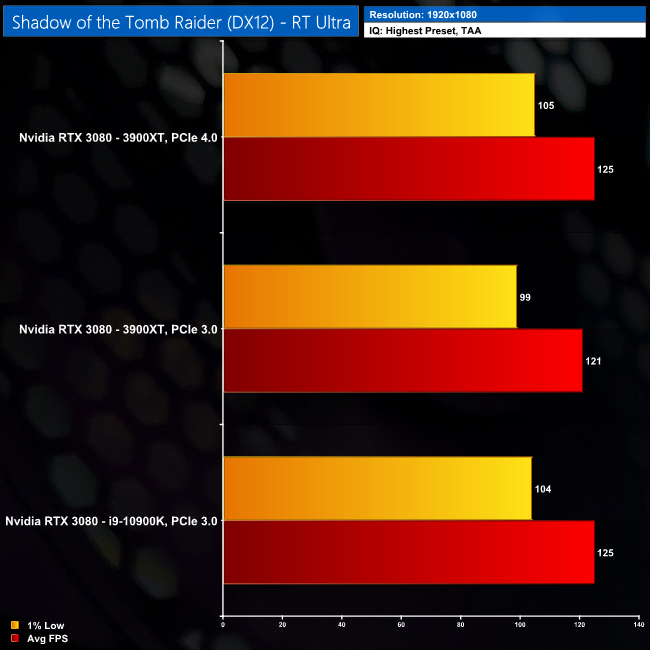 At 1080p in Shadow of the Tomb Raider, we do see some benefit to PCIe 4.0, as the 3900XT results with Gen4 are 3% higher than the same CPU running PCIe 3.0. However, that still only puts performance on par with our Intel system, which remains the case at 1440p and 4K resolutions.