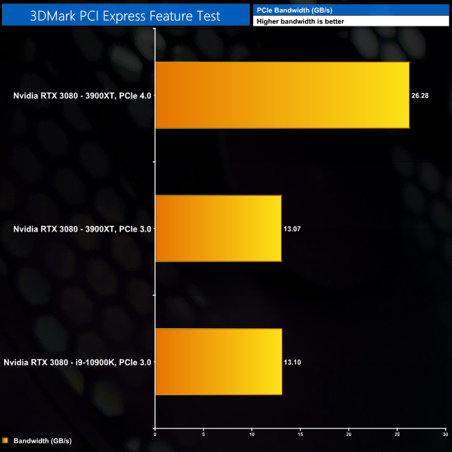 First of all, we ran 3DMark's PCI Express feature test, and the results confirm that we have double the bandwidth available through PCIe 4.0 vs 3.0.