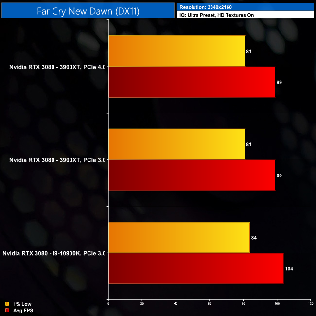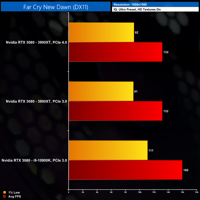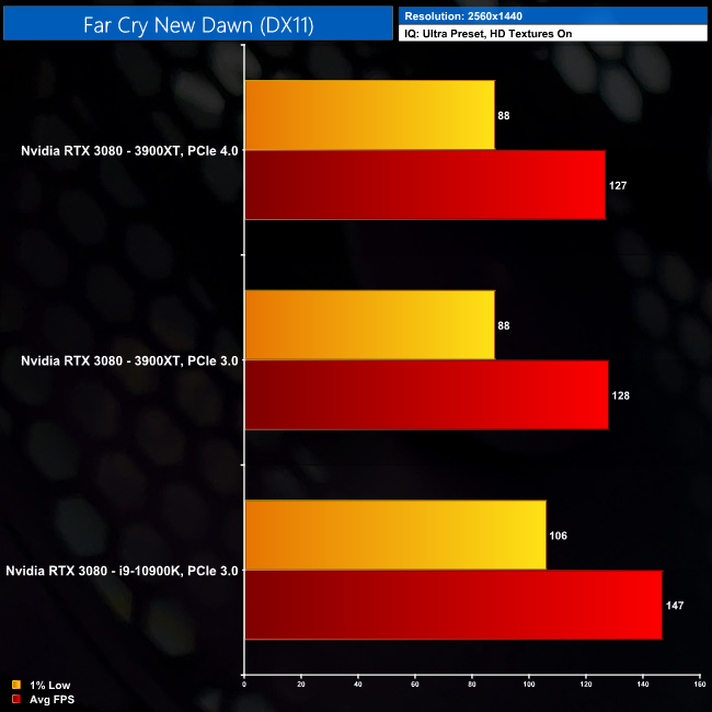 Far Cry New Dawn is the perfect example of a game that doesn't give a toss about PCIe 4.0, instead the CPU is very much the bottleneck here. At 1080p, our Intel system is 21% faster than either AMD system, with PCIe 4.0 making no difference at all.