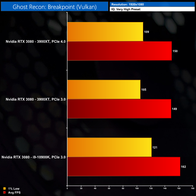 It's more of the same in Ghost Recon: Breakpoint, albeit on a slightly smaller scale. The Intel system outperforms AMD with PCIe Gen4 across every resolution we tested – there's certainly not much in it at 1440p and 4K, but the overall performance crown remains with Intel.