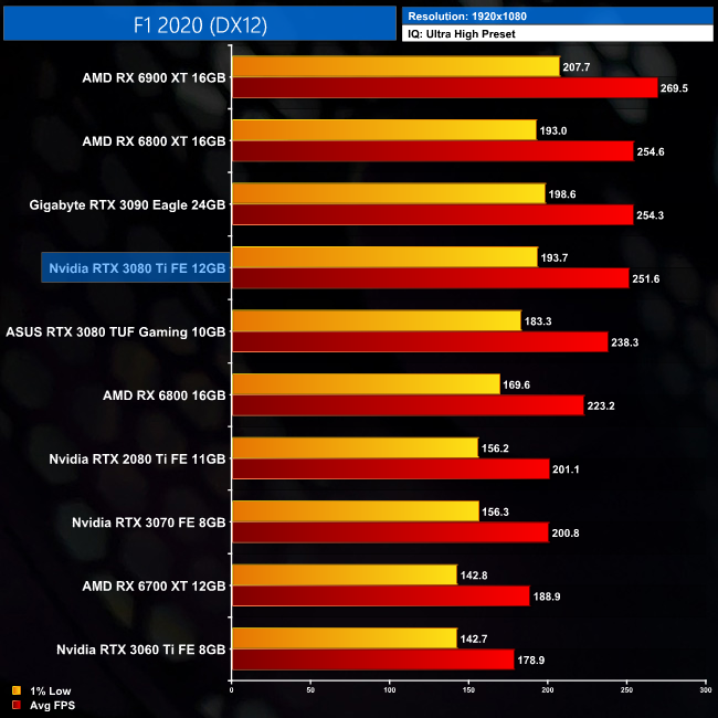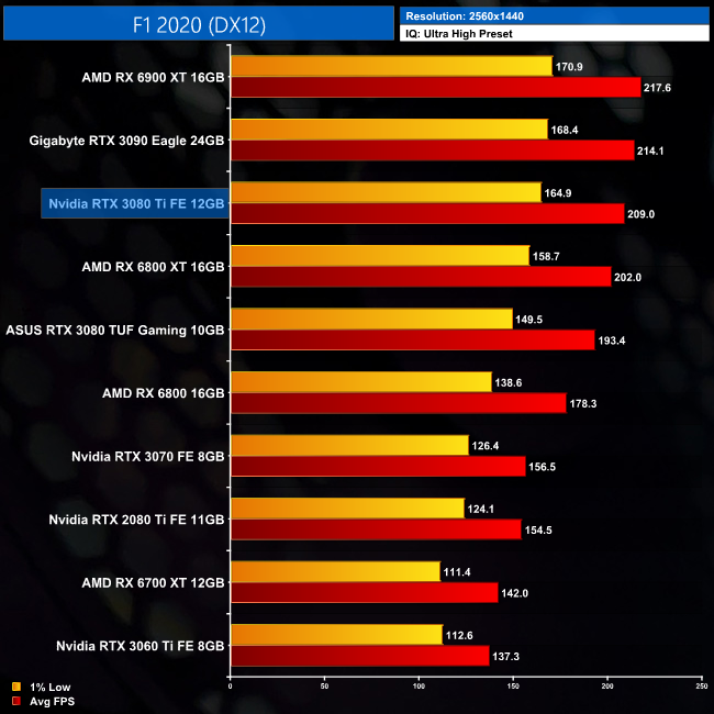 As for F1 2020, the RTX 3080 Ti is slower than the RX 6900 XT here, by a 4% margin at 1440p, though this does shrink to less than a single percent at 4K.