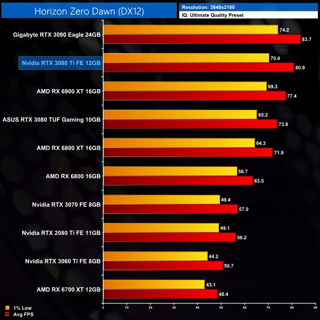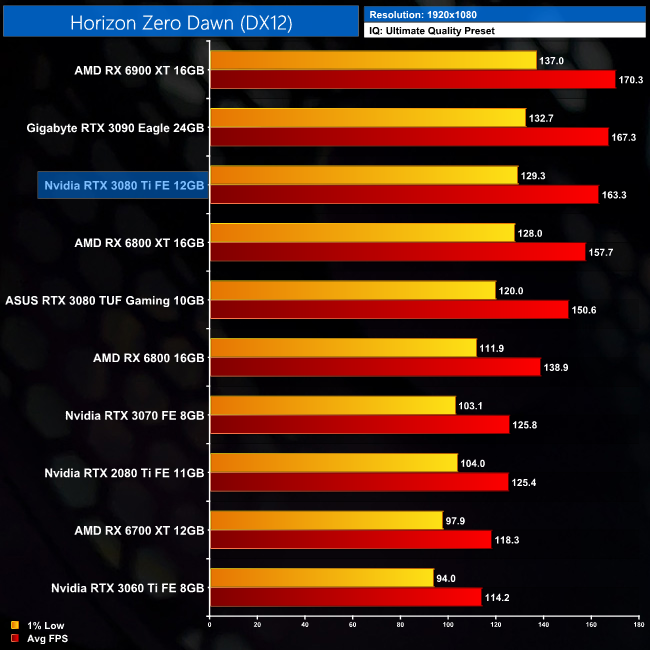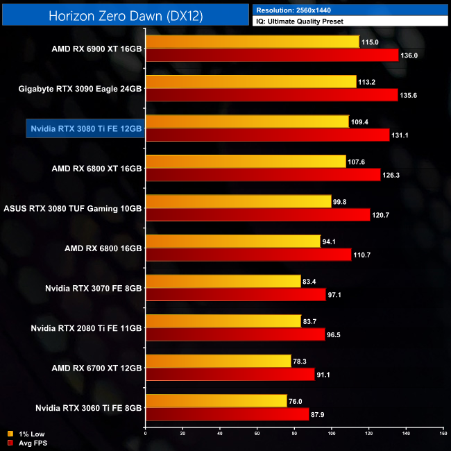 Horizon Zero Dawn is next, and this is another formerly PlayStation-exclusive title that we are looking at. At 1440p, the RTX 3080 Ti is 4% slower than the RX 6900 XT, while it offers an extra 9% over the RTX 3080. The all-important comparison against the RTX 3090 sees a difference of just 3%.