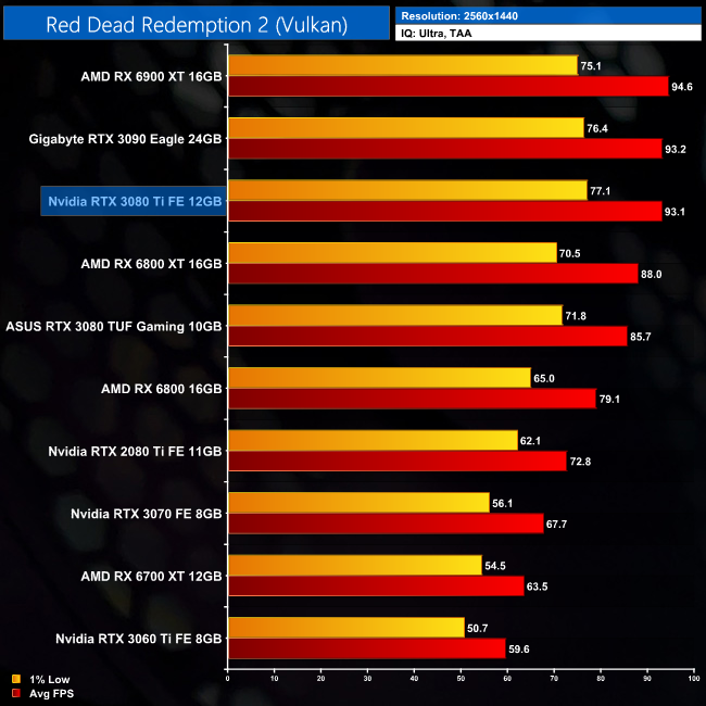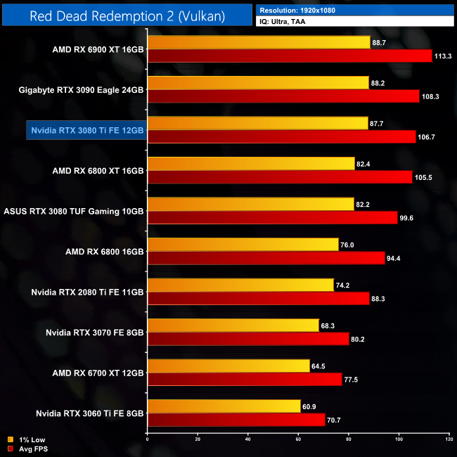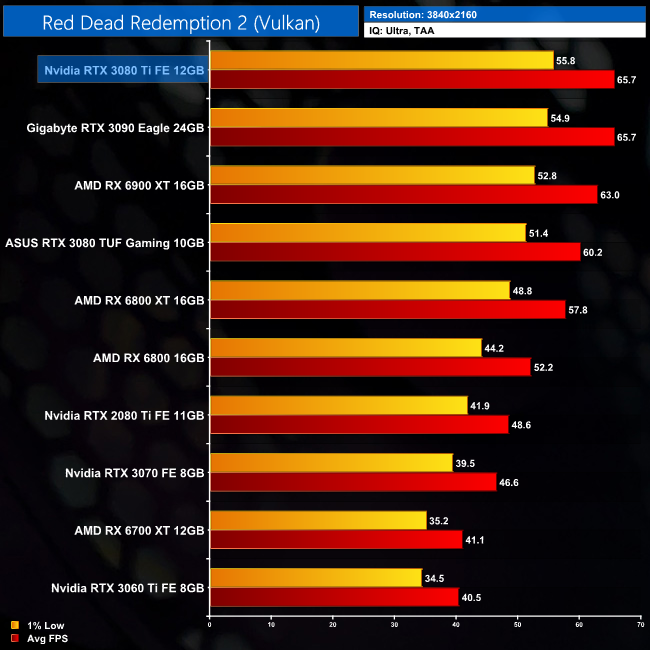 As for Red Dead Redemption 2, the differences between the RTX 3080 Ti and RTX 3090 are increasingly small in this title, to the point where we measured the same average frame rate between the two at 4K. This is the only game where this happened, but it does go to show we are talking about the finest of margins between the two Ampere GPUs.