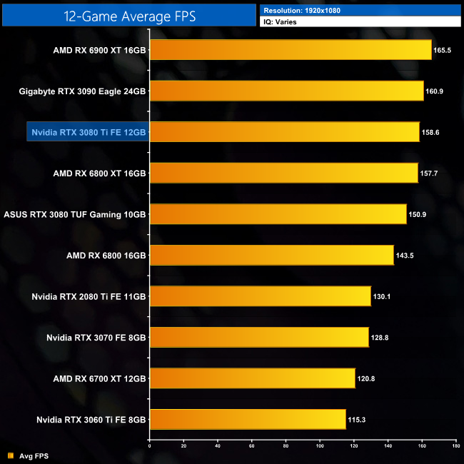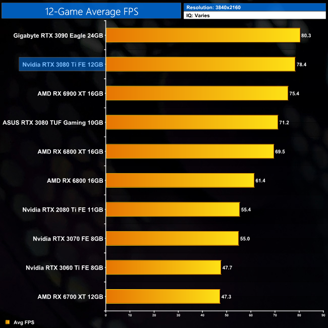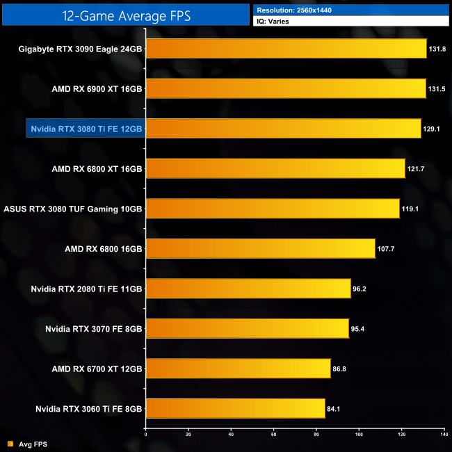 Averaged across the 12 games we have tested, it is clear to see the RTX 3080 Ti is essentially as fast as the RTX 3090, give or take a couple of percentage points. The difference is quite trivial, with a 2% margin between the two at 1440p and 4K. The differences versus the RX 6900 XT will be more variable depending on the games tested, but our sample sees the RTX 3080 Ti come in 4% faster on average at 4K. It's also 10% faster on average when compared to the RTX 3080.