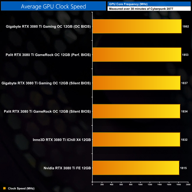 The reason we saw such similar gaming performance between all four RTX 3080 Ti cards tested, is that even the factory overclocked models don't run that much faster in terms of clock speed. The Gigabyte Gaming OC managed the highest frequency, averaging 1862MHz when using the card's OC BIOS, but that's still less than a 50MHz boost compared to the reference-clocked Founders Edition.