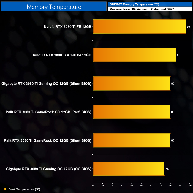 For our temperature testing, we measure the peak memory temperature under load. A reading under load comes from running Cyberpunk 2077 for 30 minutes.