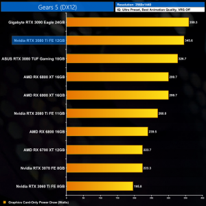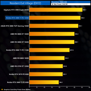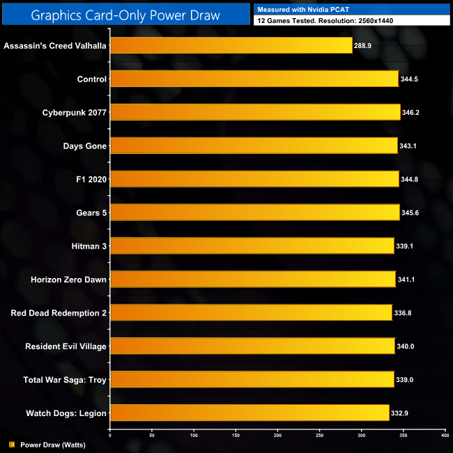 Power draw increases at 1440p to an average of 336.8W, though that's still 15-or-so Watts less than the RTX 3090.